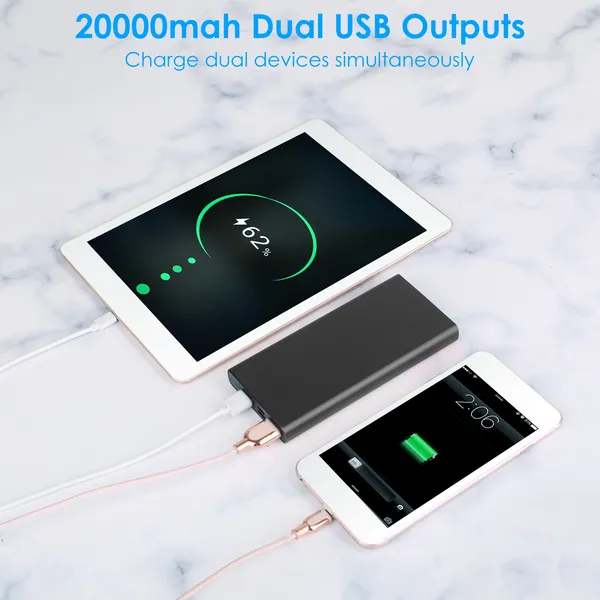 **RELIABLE DUAL CHARGING SOLUTION*:Our 20000mAh power bank detects your device automatically and enables to charge 2 electronic devices simultaneously; share the charging ports with your family or friends conveniently. Note:Electric loss may happen in the whole charging process and the recharging times depend on your devices and other factors.